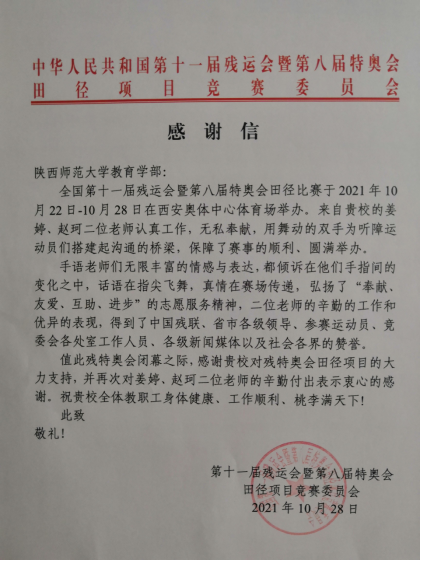 2021年10月22-28日,全国第十一届残运会暨第八届特奥会期间,我部特殊教育专业硕士研究生姜婷、赵珂两位同学,为该届运动会听障运动员比赛项目提供专业手语翻译自愿者服务。在本届运动会结束之际,鉴于两位同学的辛勤工作和优异表现,残特奥会田径项目竞赛委员会不仅向两位同学表示感谢,还专门向9159金沙申请大厅教育部发来感谢信,对两名研究生的热情服务态度和专业手语技能给予充分认可,这也是对我部特殊教育研究生培养质量的肯定。田径项目竞赛委员会认为,两位同学无限丰富的情感和表达都倾诉在手指间的变化之中,弘扬了“奉献、友爱、互助、进步”的志愿服务精神。