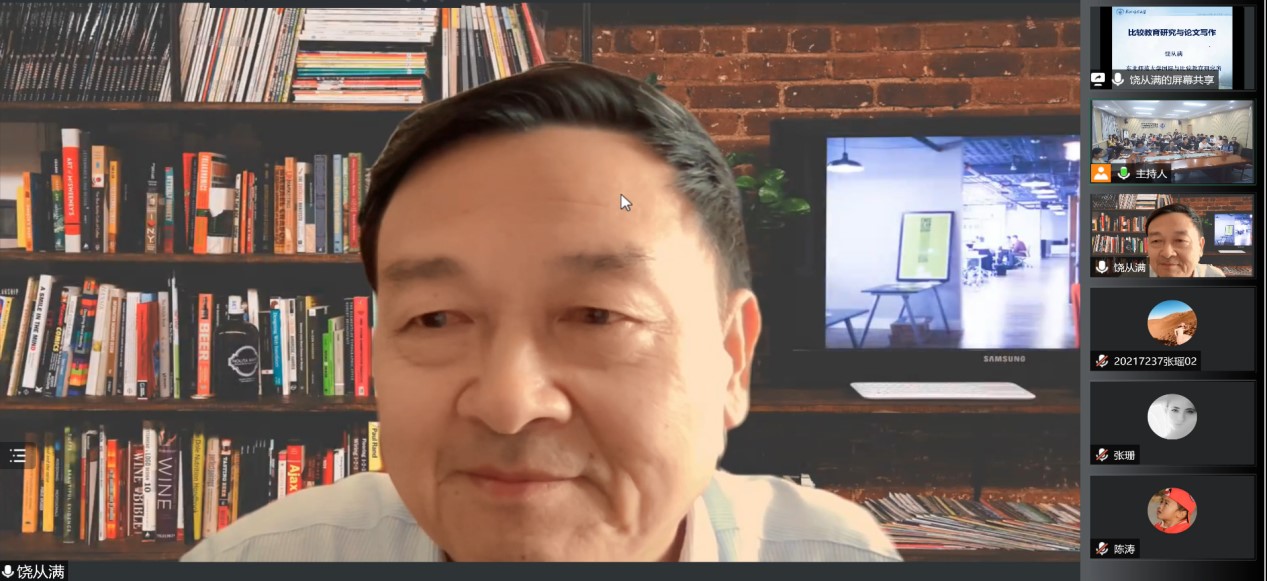 在讲座中,饶从满教授首先深刻阐释了教育研究的问题意识、理论意识、方法意识以及逻辑意识。其次,饶教授从比较教育的内涵、功能及样本三方面展开了“比较教育研究的追求”的论述,并进一步强调了国别教育研究要做好“深描”,确保“立体化”;追求“解释”,推进基于理论的国别教育研究。最后,饶教授针对比较教育论文写作中的标题、摘要、关键词、引言、逻辑结构、结论与启示以及参考文献等7个方面进行了详细阐述。陈玥副教授在总结时,认为饶教授对比较教育研究与论文写作的相关议题进行了鞭辟入里的分析,同学们也对该领域有了更全面、更深入的认识。在交流讨论环节,现场同学踊跃提问,饶教授对同学们提出的诸多问题,一一作了深入详细的回答。李延平教授在最后点评时,对饶教授在百忙之中受邀线上讲座表示诚挚的感谢,并就“研究对象的理论与研究的理论”等问题与饶教授进行了深入探讨。